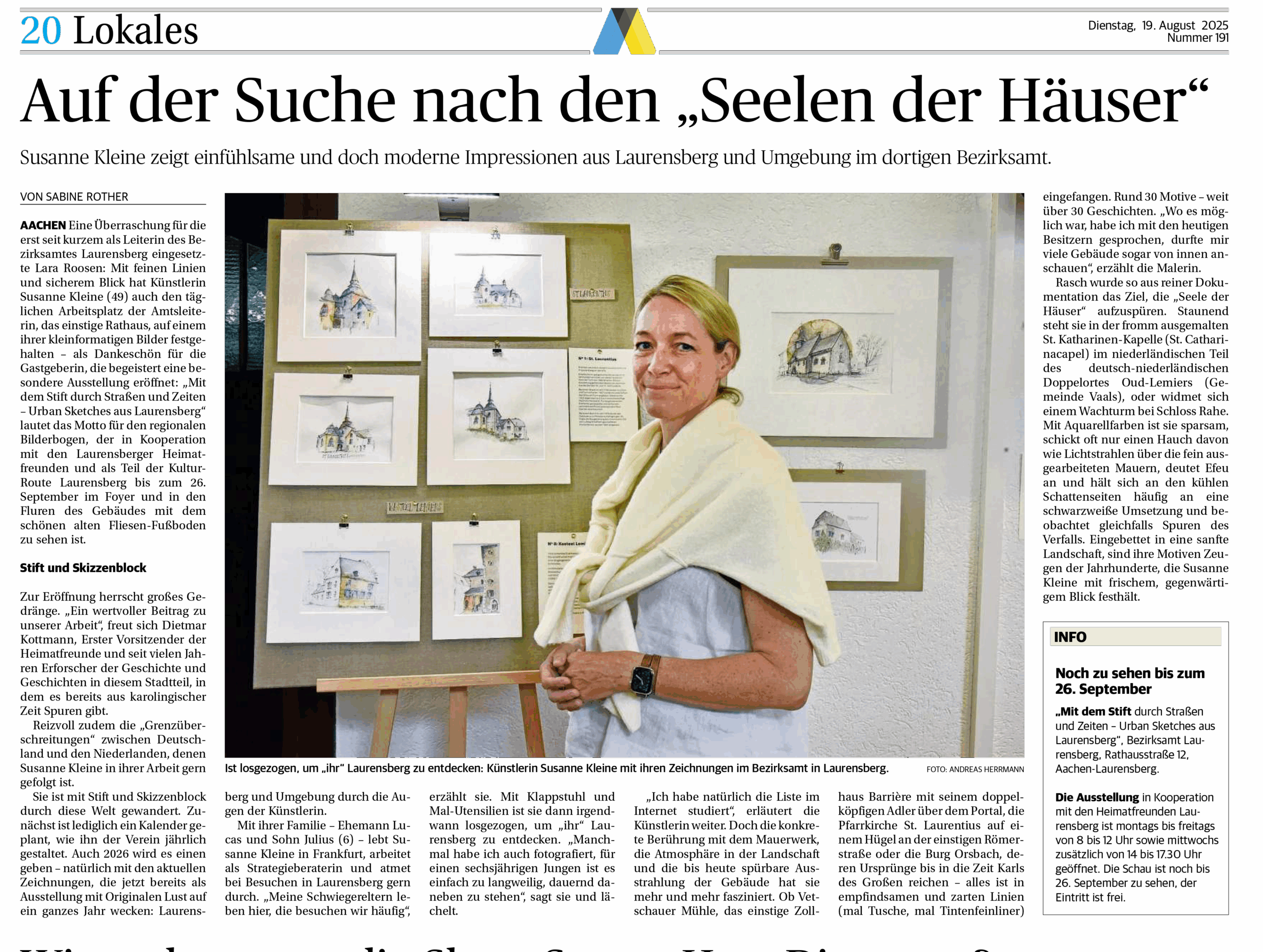 Meine Zeichungen helfen dabei, Lokalgeschichte(n) weiterzugeben, da sie Jung und Alt zum Dialog inspirieren. Genau dies ist z. B. im Rahmen meiner Ausstellung „Mit dem Stift durch Straßen und Zeiten“ geschehen, die ich gemeinsam mit den Heimatfreunden Laurensberg vergangenen August ausgerichtet habe. Die neue visuelle Perspektive hat viele Menschen neugierig gemacht und sie Orte neu entdecken lassen, von denen sie glaubten, sie längst zu kennen.